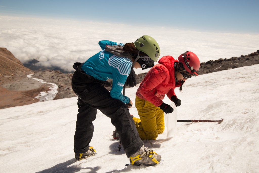 A su lado, Marcela y otra ayudante toman muestras de nieve para medir en ella el carbono que llega desde las ciudades. Hoy, los estudios químicos complementan a los radares y a la fotogrametría digital aérea, que permiten calcular la masa helada, pero Memo insiste en perforar el hielo para insertar series de balizas, grupos de cinco finos tubos de PVC que, atados con nylon, sumarán diez metros cada uno. De forma puntual y luego extrapolando datos, permitirán leer, siempre que uno suba hasta aquí, los centímetros de hielo que se han perdido.