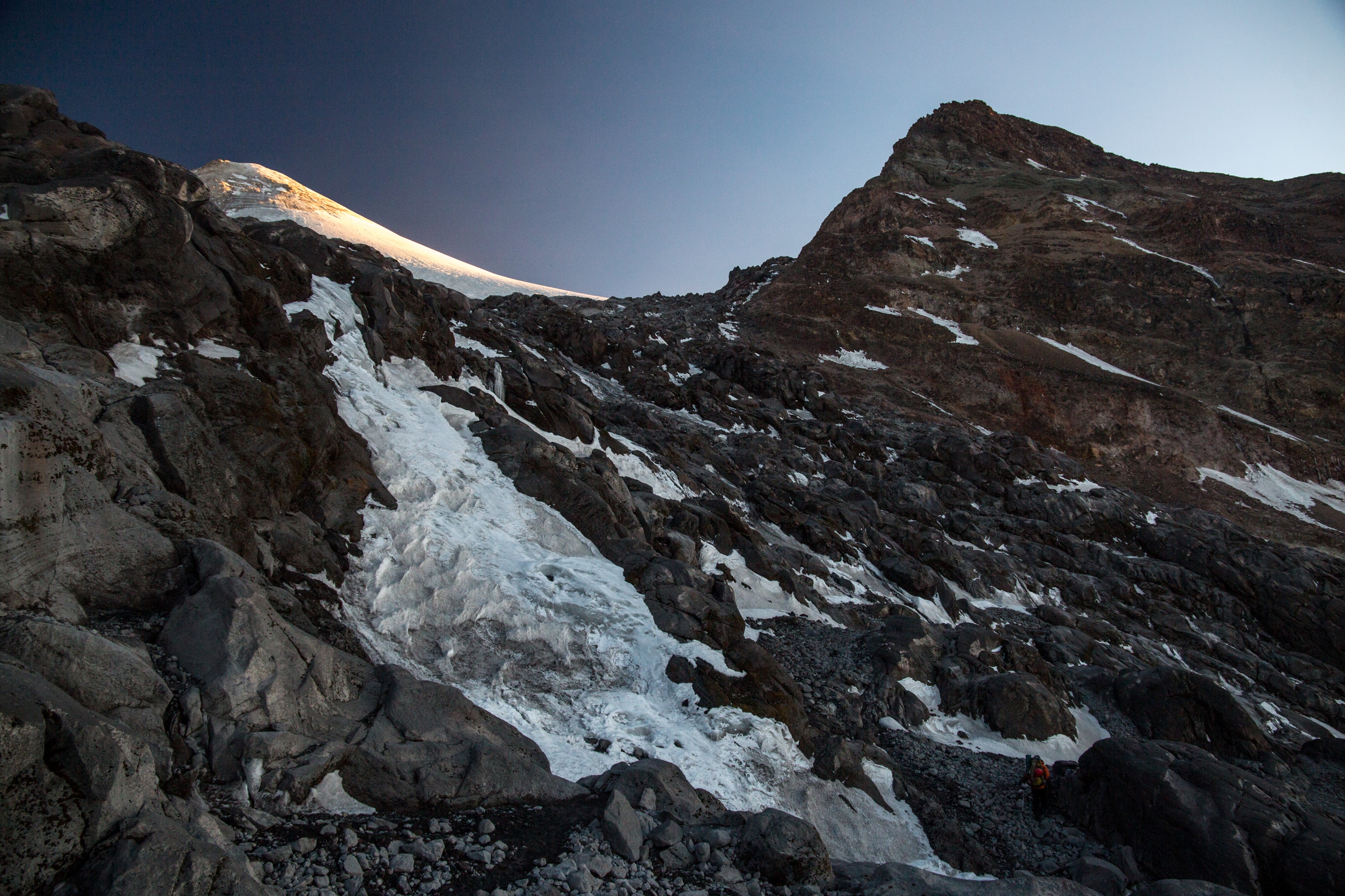 Es tardísimo, incluso han surgido las primeras nubes, pero también es el momento clave. Desandar un glaciar que lleva horas absorbiendo radiación solar significa clavar, a cada paso, diez puntas metálicas sobre un mar espumoso que se ha vuelto delicadísimo cristal. Al detenerse, además de esos cientos de fragmentos se oyen riachos subterráneos, decenas de sonajeros en una inmensidad en la que, absurdamente, el humano más grande es apenas más notorio que una mariposa. Memo baja sospechosamente lento, preocupado por llegar abajo con una tamalera que le pesa más que nunca. Pero él, que lee el tiempo en centímetros, también dirá que no puede estar satisfecho mientras el glaciar siga menguando. Extrapolado a dos décadas y a todos sus atardeceres, ese rumor de agua constante equivale a decir adiós al último glaciar.